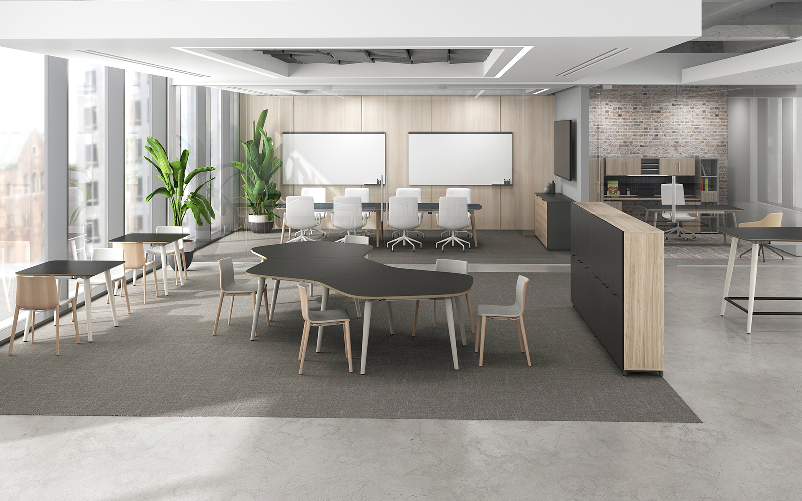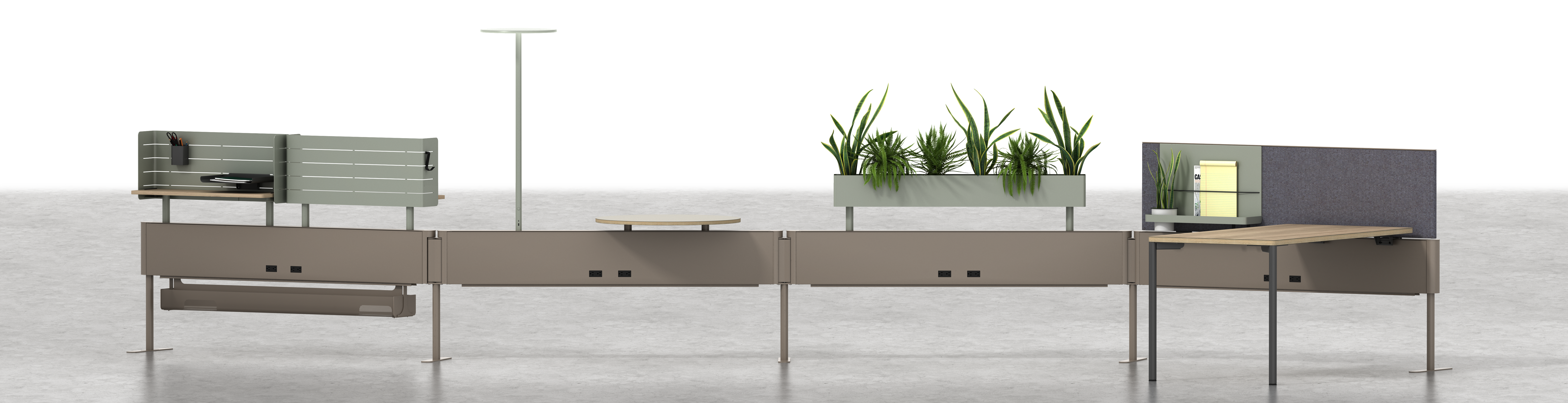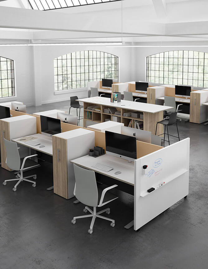 Bahn Rail and Bahn Desks with a gallery end cap and Bahn Tower. A Work Island is separating the two workstations