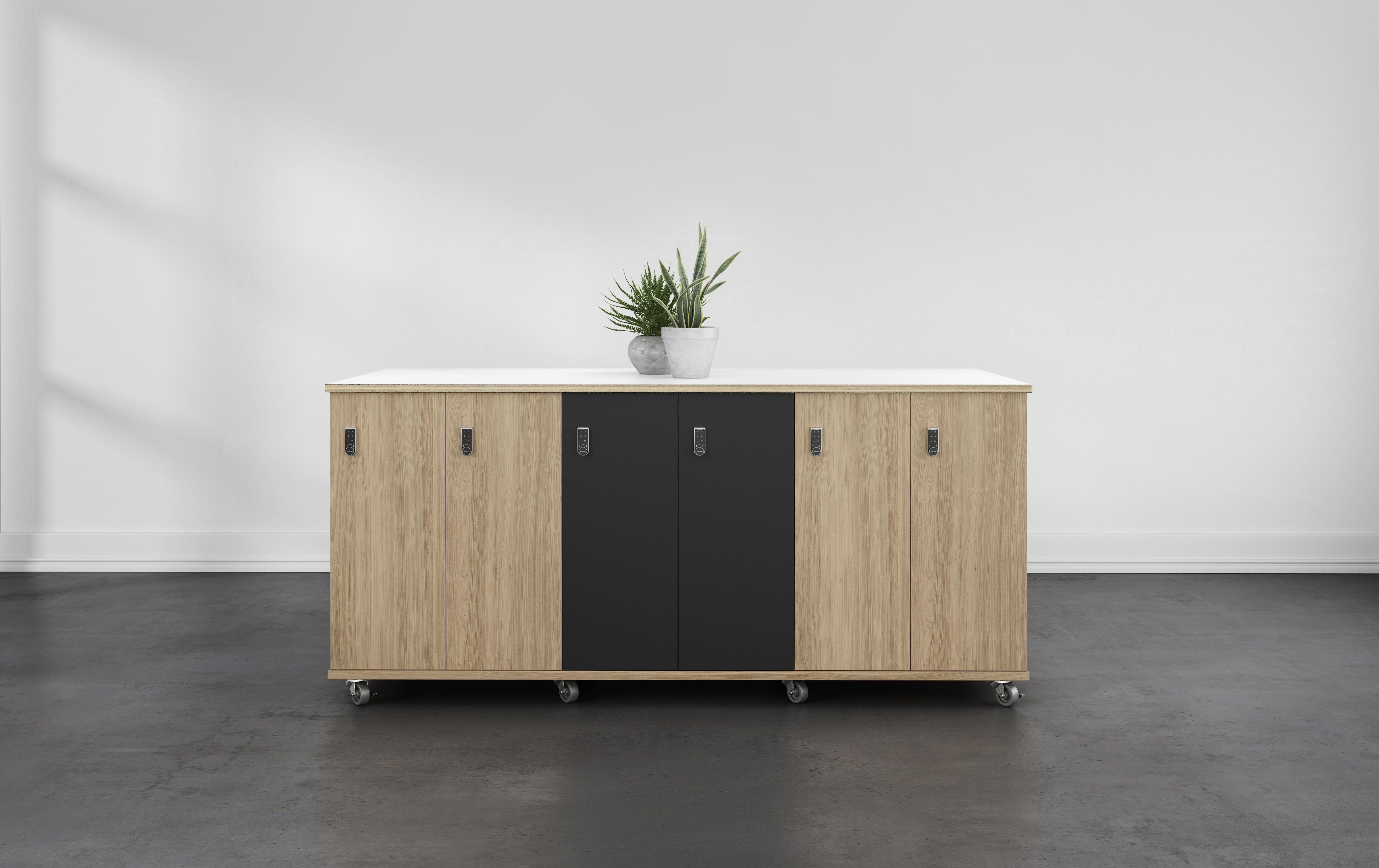 Extended corner top shape with a fabric gallery screen and Zo Storage.